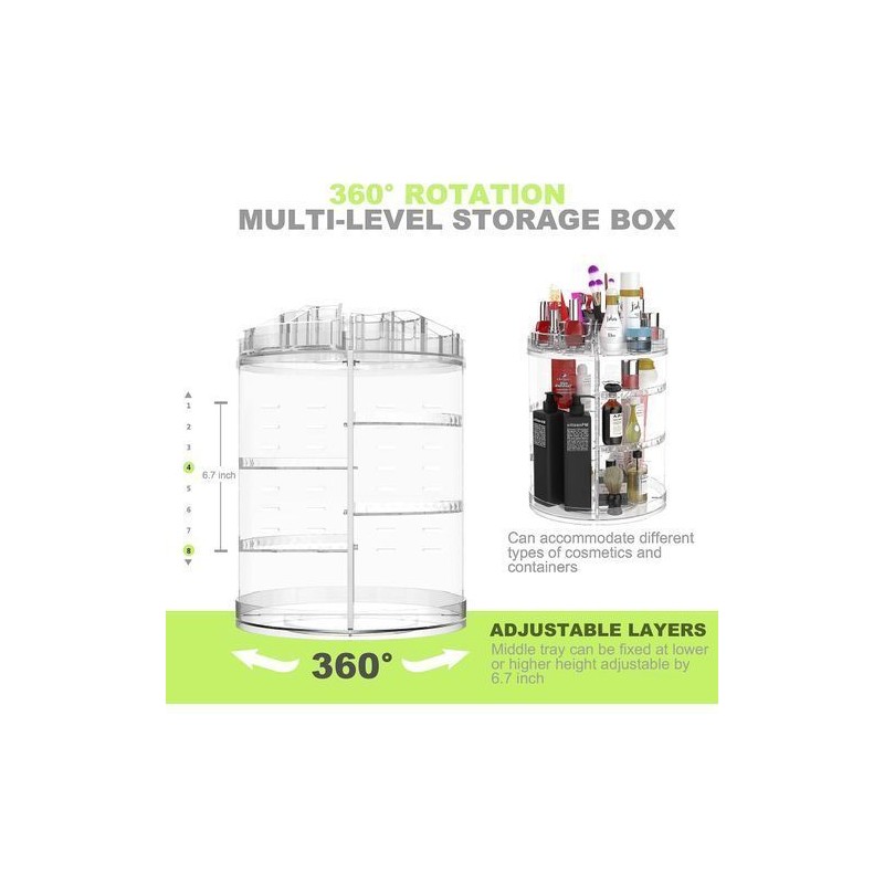 💄ÉTAGÈRES COSMÉTIQUES À COUCHES RÉGLABLES - Configurez librement une variété de partitions différentes avec des couches réglables. Vous pouvez ajuster librement la hauteur du plateau pour s'adapter à différents types de produits cosmétiques. Le plateau supérieur de très grande capacité, le plateau inférieur, 3 plateaux du milieu et 6 couches réglables dans notre stockage cosmétique rotatif peuvent stocker des articles parfaitement. Gardez tous vos produits cosmétiques en place!
