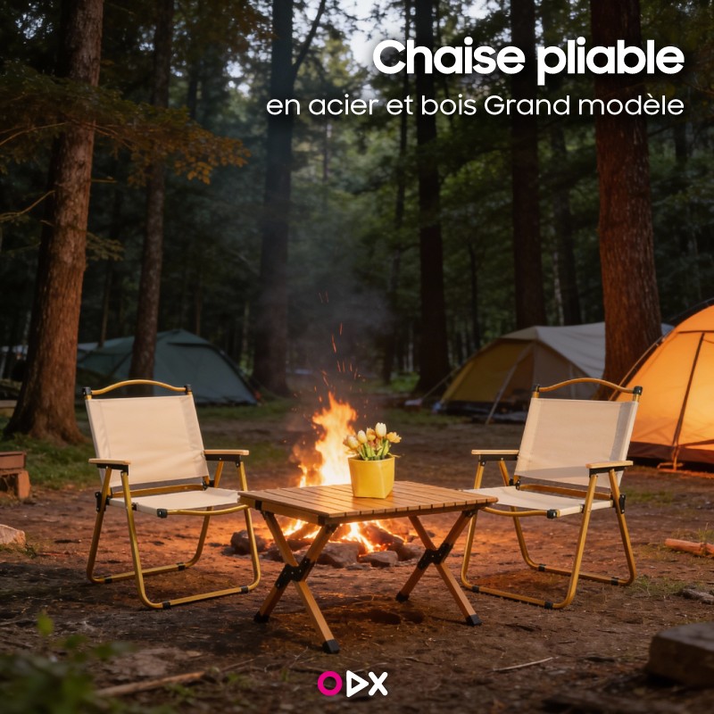 Chaise pliable alliant robustesse, confort et élégance, avec cadre en métal résistant, tissu respirant et accoudoirs en bois durable. Son dossier ergonomique réduit la fatigue, tandis que son design léger et pliable permet un transport et une installation faciles en quelques secondes.