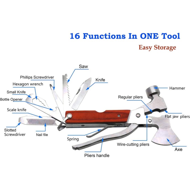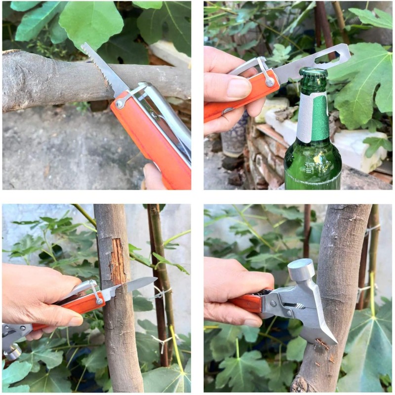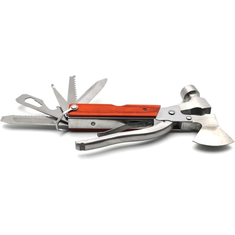 Polyvalence complète : Couteau, lame, scie, clés hexagonales, tournevis Phillips et plat, ouvre-bouteille, lime à ongles et écailleur à poisson.